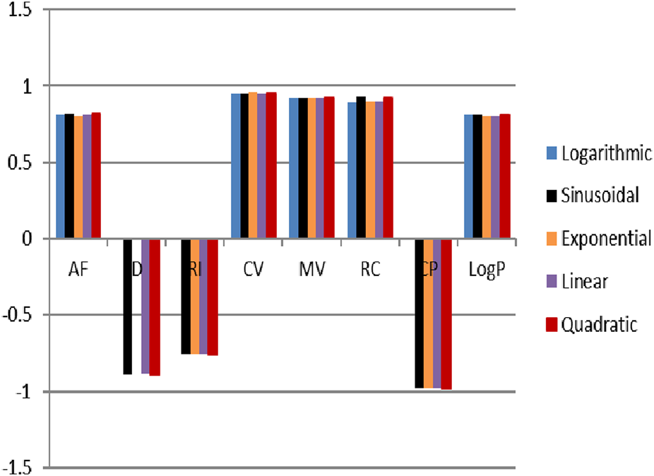 There are eight properties of octane isomers that are predicted by using six np-degree-related indices. All eight characteristics for all octane isomers are given in Table 2. A parameter can be calculated in different units, so the units of the parameters are also mentioned in Table 2. The acentric factor (AF) is a crucial metric that measures the extent to which a substance’s thermodynamic properties deviate from the predictions of the Principle of Corresponding States. The acentric factor is a dimensionless quantity that characterizes a substance’s molecular structure and its ability to interact with other molecules. Density (D) is a physical characteristic that can be calculated by dividing an object’s mass by its volume. It is a constant property that remains the same regardless of the size of the sample. There are different units used to measure density, but we use g/cm3 in this manuscript. The refractive index (RI) is a fundamental property of a material that describes how much the speed of light is reduced when it passes through it. It is calculated by dividing the speed of light in a vacuum by the speed of light in a medium with a higher density. Interestingly, this ratio has no units, making it a dimensionless quantity. The critical volume (CV) refers to the volume occupied by 1 mol of gas at a specific critical temperature and pressure. It is important to note that the critical volume is not a fixed value and varies depending on the gas being studied. The eight properties that are determined with the help of np-degree related T-indices are acentric factor (AF), density (D), refractive index (RI), critical pressure (CP), molar volume (MV), radius of curvature (RC), critical pressure (CP), and LogP. The chemical structures of octane isomers are given in Figure 3.