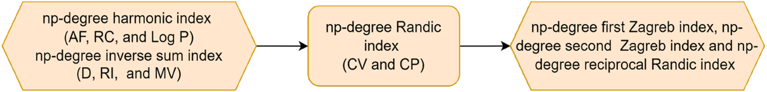The first topological index was a distance-based index; however, degree-based indices are more useful and applicable to graph invariants. Today, researchers have introduced many types of degree-based numerical descriptors. The degree of vertex work is increasing day by day. The np-degree-based indices will also prove to be a good addition to the progress of degree-based indices. In 2017, Chellali et al. proposed two new degree concepts in topological indices, called ve-degree and ev-degree [9]. The concepts of ev-degree and ve-degree are very simple yet beneficial. These indices showed a very good correlation with the benzene derivatives. In chemistry, benzene derivatives have a very important chemical structure. Rauf et al. investigated the properties of benzene derivatives using six ev-degree and ve-degree numerical descriptors [10]. These indices showed an excellent correlation with experimental values. The multi-linear regression model is used to check the significance of the results. These indices proved to be equally effective for organic and inorganic compounds, such as silicon carbides. In 2020, Jamil et al. introduced a different degree-based index called the face index [11]. It is computed by adding the internal and external degrees of the graphs. This index analyzes the structures of benzene derivatives. It observed from the computations that the new topological index can be use multiple linear regression to accurately predict the pi-electron energy and boiling points of benzenoid hydrocarbons, with a correlation coefficient of r > 0.99. The correlation of face index for some structures was approximately 1, which is a very strong correlation. Mahboob et al. [12] proposed a novel concept related to the degree known as “bi-distant.” In this concept, two edges are considered to be one edge, and we count their degrees using the classical method. The eigenvalue indices have recently been used to explore the properties of COVID-19 drug structures [13]. Entropy, first introduced in Shannon’s paper, measures the uncertainty of information content in probability distributions [14]. It was later applied to graphs and chemical networks to measure structural information. It has been widely applied in fields like chemistry, biology, ecology, and sociology. Graph entropy measures, which associate probability distributions with graph elements, can be classified as intrinsic and extrinsic measures. There are a variety of graph entropy measures. The ve-degree of end vertices of each edge-based entropy index is first proposed to investigate the two-dimensional structure of breast cancer drugs [15]. The QSPR was established using linear and cubic regression methods with SPSS, revealing a strong correlation between entropy indices and the physical properties of the drugs. The results show that the entropy indices under study have a strong correlation with the physical characteristics. All the degree-based indices are proposed to analyze the different structures. There are different types of chemical structures. To get more and more information about the properties of different structures, researchers are using more and more indices with the passage of time. The graph invariants reinforce the connection between chemistry and mathematics.