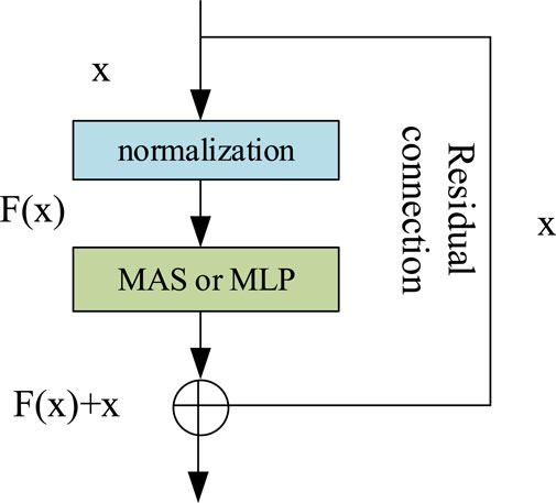 As the number of layers in the network deepens, nonlinear activation functions lead to data being mapped to more discrete spaces, making it increasingly difficult to fit the mapping function. Multilayer backpropagation may lead to gradient explosion and vanishing. The residual module is essentially a superposition operation between the nonlinear transformations of input and output, as shown in Figure 2. Among them, x is the input, and the mapping function that needs to be fitted in the network can be reconstructed as F(x)+x through residual connections. The residual connection path of the side branches makes the mapping function easier to fit when the network layers are deeper. Therefore, introducing residual modules in the MSA and MLP layers can greatly alleviate the problem of gradient vanishing and exploding as the network layers deepen.
