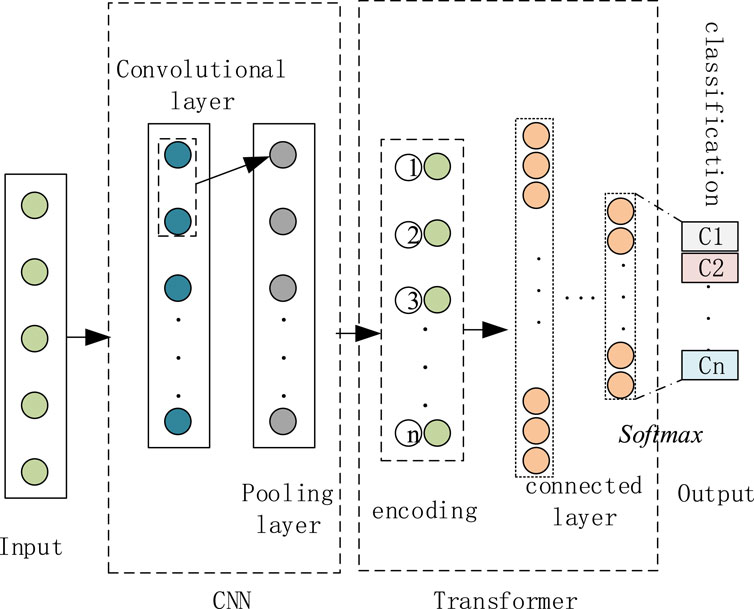 In the CNN-Transformer model, the Convolutional Neural Network component initially processes the input data. It extracts local features through convolutional layers and introduces non-linearity through activation layers such as ReLU to enhance the model’s expressive power. Pooling layers may then reduce the spatial dimensions of the features, decreasing the number of parameters. Following this, the Transformer component captures global dependencies through self-attention mechanisms and expands this capability with multi-head attention to focus on different parts of the sequence. Each self-attention layer is typically followed by a feed-forward network to further refine the feature representation. Layer normalization and residual connections are used to stabilize the training process and prevent the vanishing gradient problem. By combining the CNN’s ability to extract local features with the Transformer’s capacity to capture global dependencies, the CNN-Transformer model excels in tasks involving image processing, sequence data, and other complex pattern recognition challenges. In the direction of time series prediction, CNN is used to extract spatial features between different feature values in the sequence. It is to upscale the original signal into a two-dimensional image, and then extract deep features using CNN and other networks. To better adapt to the task of cable fault classification, convolutional layers and global average pooling structures are added, and the results are output through a fully connected layer. The improved method can better utilize the feature information of time series data and adapt to the characteristics of cable fault classification tasks. The method structure is shown in Figure 3. The CNN-Transformer model approaches the feature extraction process differently from traditional methods. While traditional CNNs are adept at capturing local features through convolutional operations, the integration with the Transformer component allows the model to not only focus on local patterns but also to leverage the Transformer’s strength in capturing long-range dependencies and contextual information across the entire input data. This fusion enables a more comprehensive feature representation, where the CNN extracts detailed spatial hierarchies and the Transformer processes these features to understand broader relationships and sequences, leading to potentially more accurate and robust models in various tasks such as image classification, natural language processing, and beyond.
