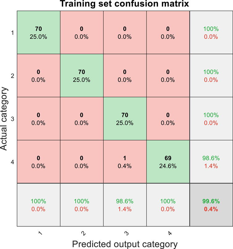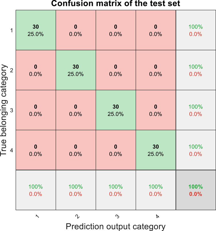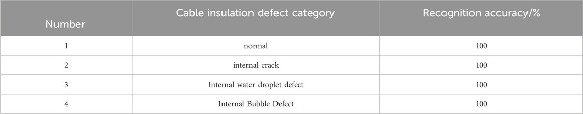 As shown in Figures 12, 13, all types of cable insulation defects can be accurately identified by the model when identifying composite cable insulation defects. In this paper, the calculated 100% accuracy rate is based on experimental results under specific conditions. This outcome was measured on a carefully selected and balanced dataset, targeting a range of predefined defect types and severity levels. The evaluation process employed standardized metrics, including precision, recall, and the F1 score, and utilized cross-validation and an independent test set to ensure the accuracy and reproducibility of the results. Moreover, the model considered various potential defect scenarios during both training and testing phases to enhance its generalization capabilities. However, it should be noted that this accuracy rate may be subject to the constraints of the experimental conditions, and the complexities encountered in real-world applications may impact the model’s performance.