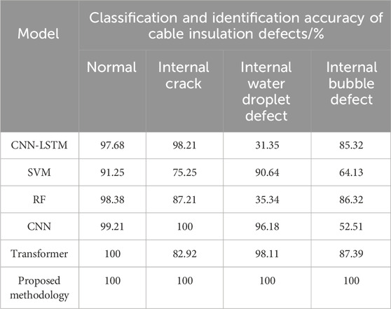 From the data in Table 3, it can be seen that compared to traditional machine learning model classifiers and neural networks, the model proposed in this paper has the highest accuracy in identifying four types of cable insulation defects. The comparison results demonstrate the superiority of the Transformer model over other models in Transformer cable insulation defect recognition.