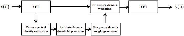 The detailed implementation process of interference suppression in Figure 3 is illustrated in Figure 4. The interference suppression component is the core of frequency-domain anti-jamming, which is divided into FFT-based power spectral density estimation, anti-jamming threshold generation, frequency-domain weight generation, and weighting. Among these, threshold generation is the key to interference suppression. In other words, a reasonable interference detection threshold is crucial for frequency-domain anti-jamming, and whether the threshold is set appropriately largely determines the performance of the frequency-domain anti-jamming algorithm.