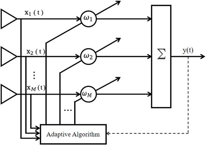 Spatial filtering is one of the most effective methods for suppressing spatial interference signals. It employs adaptive null-steering antennas to achieve adaptive filtering functions. The working principle involves using adaptive weighting coefficients to control the antenna pattern, thereby filtering out interference signals in the spatial domain without degrading the gain of the desired signal [81]. The structure is shown in Figure 5.