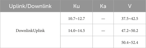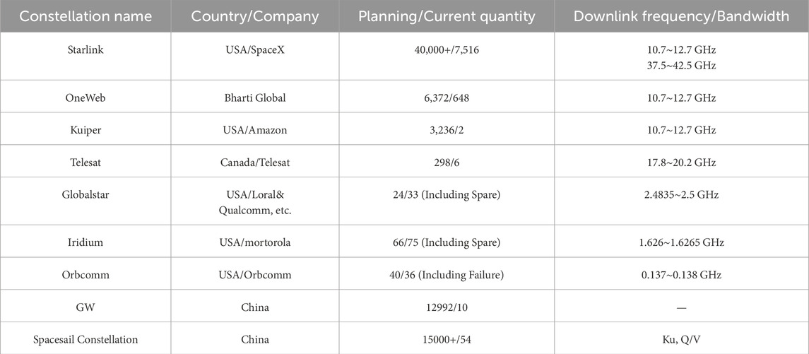 Currently, LEO constellations can be categorized into three types based on their construction maturity: ① Traditional LEO constellations that have been completed and networked, primarily consisting of narrowband communication satellite constellations. Examples include the United States’ Iridium, Globalstar, Swarm SpaceBEE, France’s Argos, and the jointly constructed Orbcomm satellites by the United States and Canada. These operate in frequency ranges from VHF to L-band and mainly provide narrowband communication services to the ground [17–19]. ② LEO constellations that have been planned and have undergone significant satellite launches, primarily broadband internet satellite systems, mainly using Ku-band and higher frequency signals. The main goal is to provide broadband internet access services to the ground through large-scale LEO constellations, achieving global seamless coverage through satellite networking. Currently under construction are the UK’s OneWeb and the United States’ Starlink constellations. OneWeb has completed the launch and networking of its first-generation internet constellation, with 618 satellites in orbit at an operational altitude of 1,200 km. As of March 2025, Starlink has successfully launched over 6,000 satellites, with 5,614 still operational in orbit, making it the largest LEO internet constellation currently in service. These satellites are primarily deployed to build a global LEO satellite internet network, providing coverage for fixed, mobile, maritime, and aeronautical users. By the end of 2024, the system had delivered satellite internet services to over 4 million users across nearly 100 countries. SpaceX is accelerating Starlink satellite deployment through its Starship program. On 6 March 2025, the eighth test flight of Starship was completed, successfully validating its payload deployment capability, including the release of four Starlink satellite simulators. The test also demonstrated upgraded atmospheric re-entry technology and propulsion systems, laying the groundwork for future large-scale satellite deployment [20]. ③ Constellations that have been planned but have only launched a small number of satellites, with functions and frequency bands similar to the aforementioned broadband internet constellations. These include Canada’s Telesat and China’s StarNet, Xingyun Project, Tianqi Satellites, and Galaxy Aerospace, among others. Additionally, some independent LEO satellite navigation and timing systems are being constructed to enhance the anti-jamming capabilities of traditional GNSS, including China’s Weili Space and the United States’ Pulsar. According to the UCS satellite database, LEO satellites account for nearly 90% of all operational satellites in orbit. In the coming years, the number of global LEO satellites in orbit is expected to exceed 22,000, providing a vast number of radiation sources for LEO satellite positioning, making it a key research subject for signal of opportunity positioning [21]. The current major LEO satellite constellations domestically are shown in Table 1.