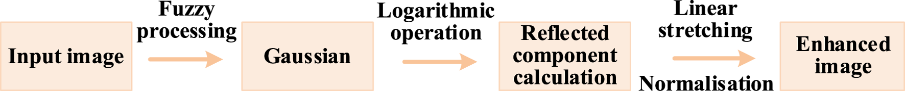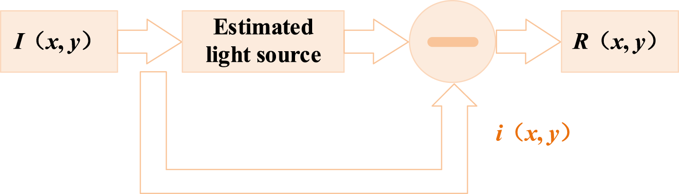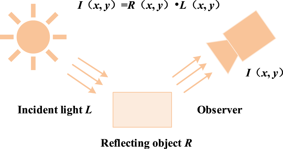 In contrast to the traditional linear and non-linear methods that can only enhance a certain type of features in an image, Retinex can strike a balance between dynamic range compression, edge enhancement and colour constancy, and therefore can adaptively enhance a wide range of different types of images. Retinex theory suggests that the image I (x, y) is the final image data we get, consisting of an illumination image and a reflection image. Firstly, it is illuminated by the incident light, then reflected by the object into the imaging system, and finally forms the image we see, as shown in the following equations: the former refers to the illumination component, which describes the distribution of the ambient light, and is usually a low-frequency signal (e.g., shadows, luminance gradient), denoted by L (x, y); and the latter refers to the reflection component, which reflects the intrinsic properties of the object (e.g., texture, colour), and is a high-frequency signal, denoted by R (x, y), as shown in Equation 1. The Retinex image principle as illustrated in Figure 1.