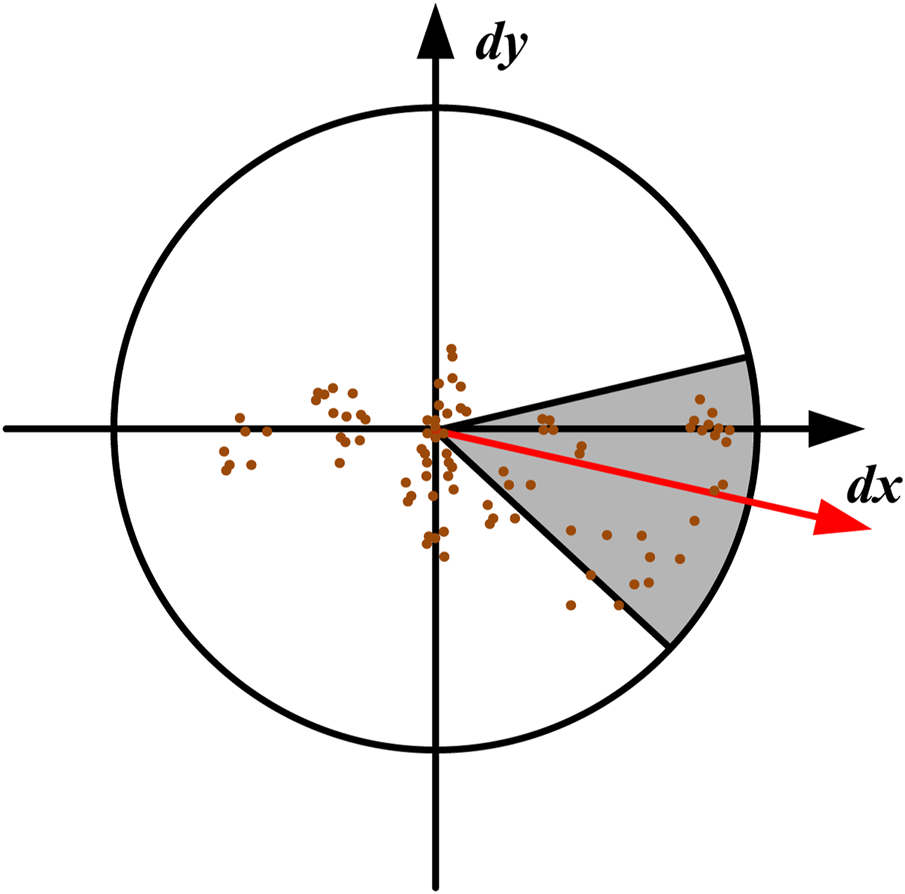 In the circular neighborhood of the feature point, the sum of horizontal and vertical Haar wavelet features of all the points in the 60-degree sector is counted, and then the sector is rotated at certain intervals and after counting the values of the Haar wavelet features in the region again, the direction of the sector with the largest value is finally taken as the main direction of the feature point. The schematic diagram of feature point direction assignment is shown Figure 5. The specific method is to first draw a circle with a diameter of 6s at the location of the feature point, with s as the scale. Calculate the HaarX and HaarY features at each point in this circle sampled at s*s intervals, and calculate the feature direction of each point at the same time: θi = arctan (HaarY/HaarX). The respective sums sumX and sumY of the HarrX and HarrY of the points falling within the angular range of the sector are counted in a 60-degree sector, which is rotated around the center with an accuracy of 15° at a time, and the direction of the sector that maximizes the modal length of sum is selected as the direction of the feature point. If a secondary peak exists with magnitude exceeding 80% of the maximum response, multi-directional feature points are generated.