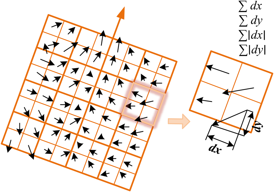 To generate 64- or 128-dimensional vectors describing the texture information around feature points, the following procedure is employed: First, a 20σ×20σ region centered at the feature point is divided into 4 × 4 sub-regions. Within each sub-region, the horizontal and vertical Haar wavelet responses (dx and dy) are computed at 25 uniformly sampled points, and four key statistical measures are aggregated: the sum of horizontal responses (∑dx), the sum of absolute horizontal responses (∑|dx|), the sum of vertical responses (∑dy), and the sum of absolute vertical responses (∑|dy|). Each sub-region contributes four feature values, ultimately forming a 64-dimensional descriptor vector. Finally, normalization is applied to enhance the descriptor’s robustness to illumination variations, thereby achieving an effective representation of local texture information. A schematic diagram of the feature descriptor generation principle is illustrated in Figure 6.
