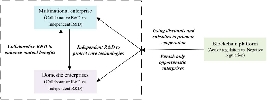 In the context of the low-carbon economic transition, MNEs and local enterprises can leverage blockchain platforms for data sharing, resource pooling, and technological exchanges to foster the development of low-carbon emission reduction technologies, thereby forming beneficial collaborative relationships. However, the opportunistic behavior that generates betrayal benefits often hinders cooperation between enterprises. MNEs and local enterprises can choose either to cooperate in the development of low-carbon technologies or to engage in independent research and development (R&D). Meanwhile, the blockchain platform can either adopt an active or passive regulatory approach. Cooperative R&D through the blockchain platform’s data, technology, and resource-sharing capabilities can reduce costs and improve emission reduction outcomes, but it also carries the risk of technology leakage. Independent R&D protects core technologies but may incur higher costs. Active regulation by the blockchain platform incentivizes cooperation through subsidies and financial incentives, while passive regulation penalizes opportunistic behavior and constrains corporate actions. The interaction between these strategies determines the respective gains and costs for each player, thereby influencing their long-term evolutionary trends and ultimately resulting in a dynamic equilibrium.