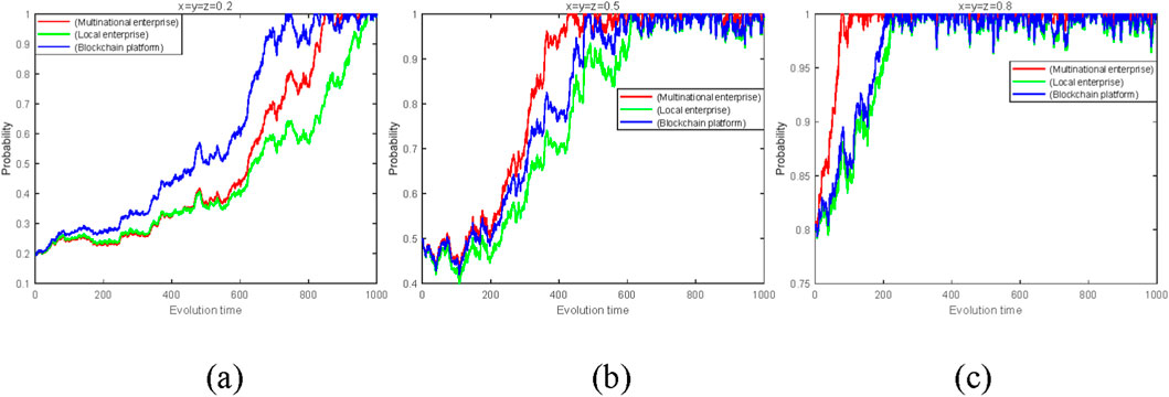 Figure 2. Evolution of a three-party strategy (multinational corporation (x), local firm (y), blockchain platform (z)) under varying initial cooperation probabilities. (a) Low cooperation probability (x, y, z = 0.2). (b) Moderate cooperation probability (x, y, z = 0.5). (c) High cooperation probability (x, y, z = 0.8).