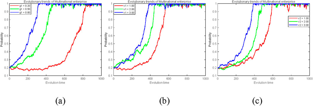 Figure 3. The influence of cooperative benefit parameters on the strategic evolution of MNEs’ strategies (x). (a) Low-carbon technology level g1 (0.2, 0.5, 0.8). (b) Additional benefits under proactive regulation v1 (1, 2, 3). (c) Additional benefits under passive regulation v2 (1, 2, 3).