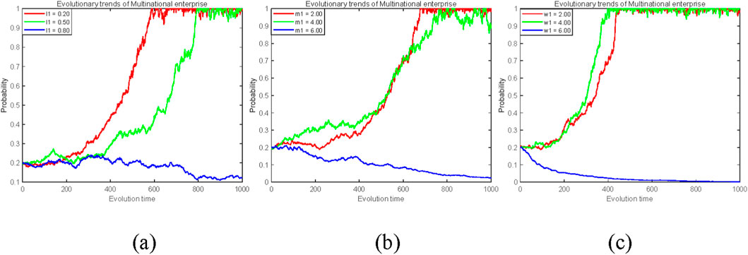Figure 4. The influence of opportunism and spillover loss parameters on the strategic evolution of MNEs (x). (a) Independent R&D cost reduction coefficient l1 (0.2, 0.5, 0.8). (b) Opportunistic gains m1 (2, 4, 6). (c) Technological spillover loss w1 (2, 4, 6).