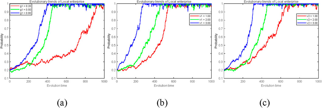 Figure 5. Effects of cooperative benefit parameters on the strategy evolution of local firms (y). (a) Carbon reduction technology level g1 (0.2, 0.5, 0.8). (b) Additional benefit under active regulation v1 (1, 2, 3). (c) Additional benefit under passive regulation v2 (1, 2, 3).