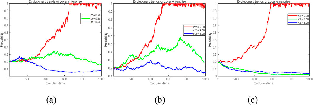 Figure 6. The impact of opportunism and spillover loss parameters on the evolution of local firms Strategies (y). (a) Independent R&D cost reduction coefficient l2 (0.2, 0.5, 0.8). (b) Opportunistic gains m2 (2, 4, 6). (c) Technological spillover loss w2 (2, 4, 6).