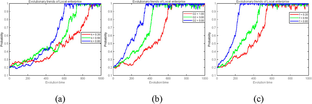 Figure 7. The Impact of platform regulatory mechanism parameters on the evolution of local firms (y) strategies. (a) Active regulatory cost reduction coefficient k (0.2, 0.5, 0.8). (b) Dynamic subsidy cap G2 (1, 3, 5). (c) Penalty intensity under passive regulation f (0.2, 0.5, 0.8).