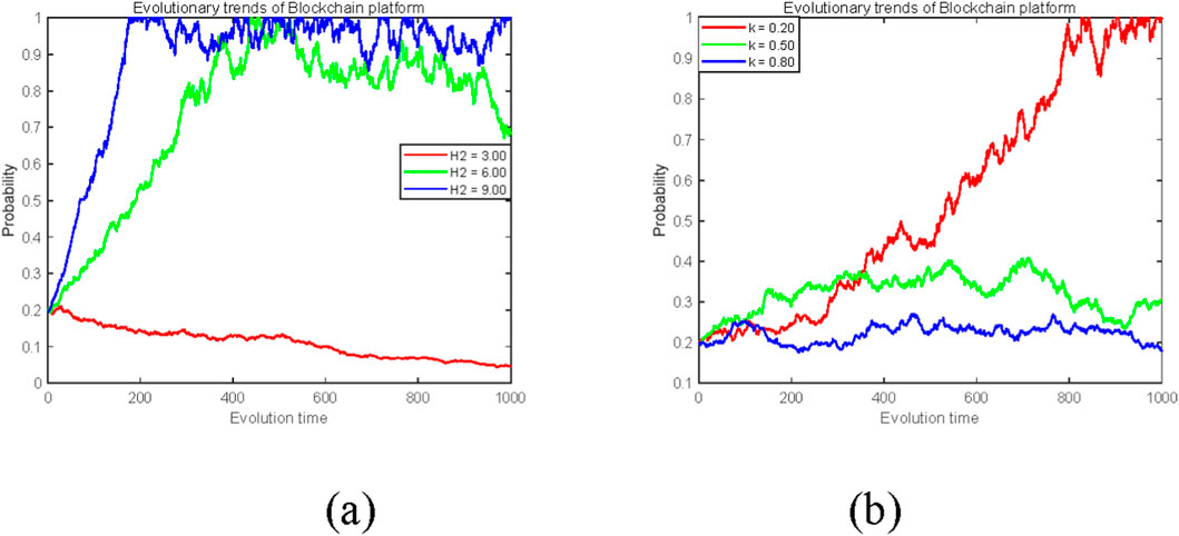 Figure 8. The influence of platform revenue and cost parameters on the evolution of platform (z) strategy. (a) Reputation revenue H2 (3, 6, 9). (b) Cost reduction coefficient k (0.2, 0.5, 0.8).