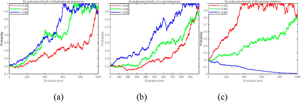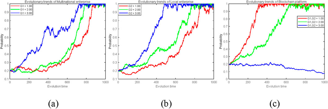 In cross-border low-carbon technology emission reduction, when the initial probability is low, as shown in Figure 2a, the strategy evolution speed of the three party game subjects is blockchain platform > multinational enterprises > local enterprises. During this period, the environment for cross-border economic cooperation was poor, and behaviors such as “free riding” were more serious. Due to the weak awareness of healthy development of cross-border low-carbon technology cooperation among various entities, the willingness of multinational and local enterprise platforms to cooperate in research and development was not strong. The blockchain platform plays a guiding role by actively regulating and promoting cross-border low-carbon emission reduction technology research and development cooperation. After effective incentives on blockchain platforms, multinational and local enterprises have accelerated their pace of collaborative research and development, reducing the occurrence of “free riding” behavior and promoting the transaction and reputation benefits of blockchain platforms, achieving maximum self-interest. As BMW Group and Indian supply chain companies collaborate on battery recycling technology research and development through the VeChain blockchain platform, the platform initially set up a $2 million default deposit pool, ultimately reducing free riding behavior by 37%.