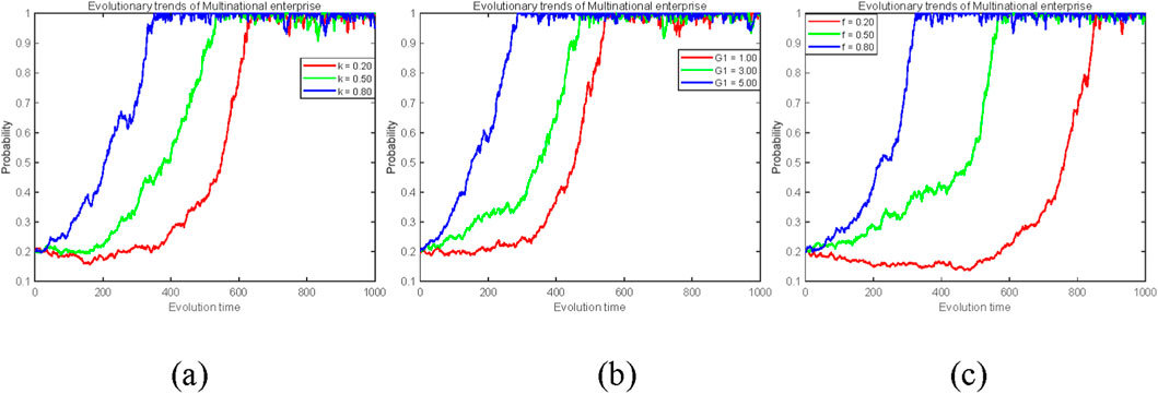 Figure 12. The impact of platform regulatory mechanism parameters on the evolution of MNEs’ strategies (x). (a) Active regulatory cost reduction coefficient k (0.2, 0.5, 0.8). (b) Dynamic subsidy cap G1 (1, 3, 5). (c) Penalty intensity under passive regulation f (0.2, 0.5, 0.8).
