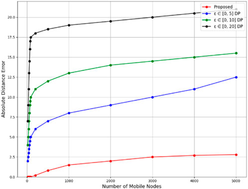 The primary purpose of this figure is to validate that P3TRTA-RDQL avoids the inherent trade-off in DP between privacy and data utility: as the number of mobile nodes increases (from 20 to 5000), DP mechanisms show a significant decline in data accuracy, because higher node density amplifies the distortion caused by noise addition. In contrast, P3TRTA-RDQL maintains stable accuracy by preserving relative location information through LSKeyGen and dynamic obfuscation, without relying on noise injection. For smaller node counts (50–200), the absolute distance error remains near-zero, reflecting the precision of LSKeyGen’s location-based key generation and P3TRTA’s dynamic obfuscation, which preserve relative distance information without noise injection. However, at larger scales, the absolute distance error slightly increases due to heightened competition among nodes, which amplifies minor variations in obfuscated location hashes. This deviation arises because RDQL prioritizes uniform spatial distribution over strictly minimizing distance errors, leading to a trade-off that ensures broader coverage but marginally impacts precision at higher densities.