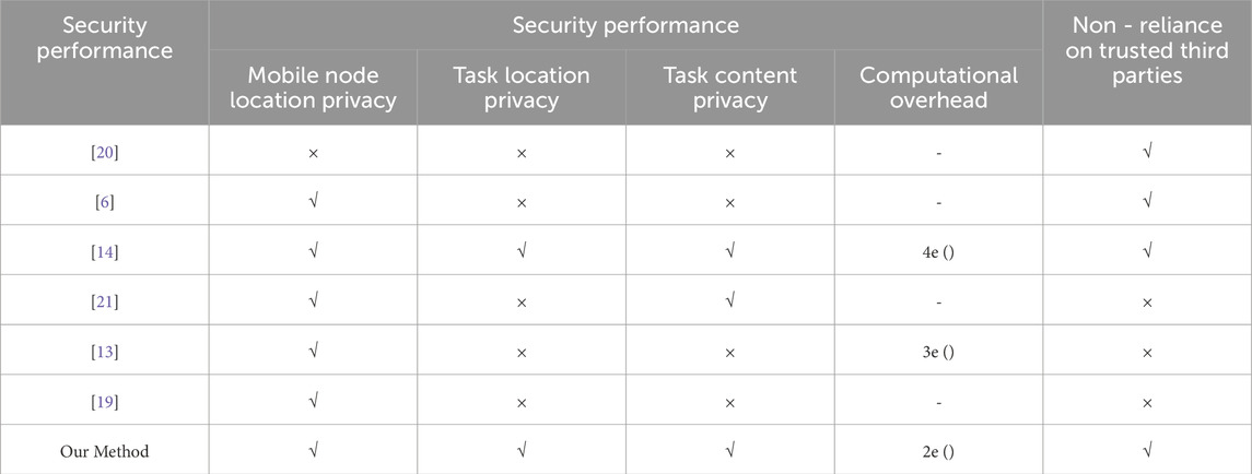 Table 1 presents an analysis and comparison of security performance. Except for the work in Ref. [22], all other works in the table achieve the protection of node location privacy. Only the works in Refs. [1, 6] in the table can achieve the privacy protection of task content and task location, and these two works rely heavily on a credit mechanism for task allocation. The works in Refs. [6, 21] rely on a trusted third party to achieve privacy protection, while in Refs. [20, 23], due to the application of differential privacy technology, noise is introduced into the data, resulting in a decrease in the accuracy of task allocation. In addition, Table 1 also compares the computational overhead in terms of privacy protection, where e () represents the computational overhead of performing a bilinear mapping operation. Generally, the computational overhead generated by running a bilinear mapping operation is much larger than that generated by performing other operations, so the number of e () can be used to represent the computational overhead. In conclusion, based on Table 1, we can conclude that the proposed P3TRTA - RDQL scheme has good security performance and low computational overhead.