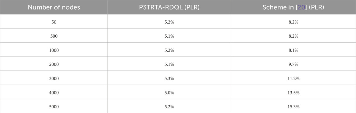 The results of the scalability study are shown in Table 2. In terms of privacy protection (Table 2), the PLR of P3TRTA-RDQL remained stable at approximately 5% regardless of the number of nodes, indicating that the combination of LSKeyGen and proxy re-encryption can effectively resist privacy leakage risks even in large-scale node deployments. In contrast, the PLR of the scheme in [20] increased from 8% to 15% as the number of nodes increased, because the obfuscation effect of differential privacy is weakened in dense node scenarios, making it easier for attackers to infer real location information through data correlation analysis.