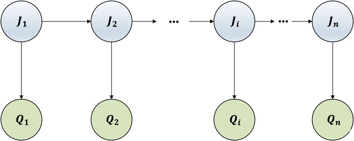 Definition 5. An HMM [33], as a type of Markov chain, is a dynamic Bayesian net with the simplest structure and a classical directed graph model. The variables in an HMM are divided into two groups. One group of variables is the set of state variables