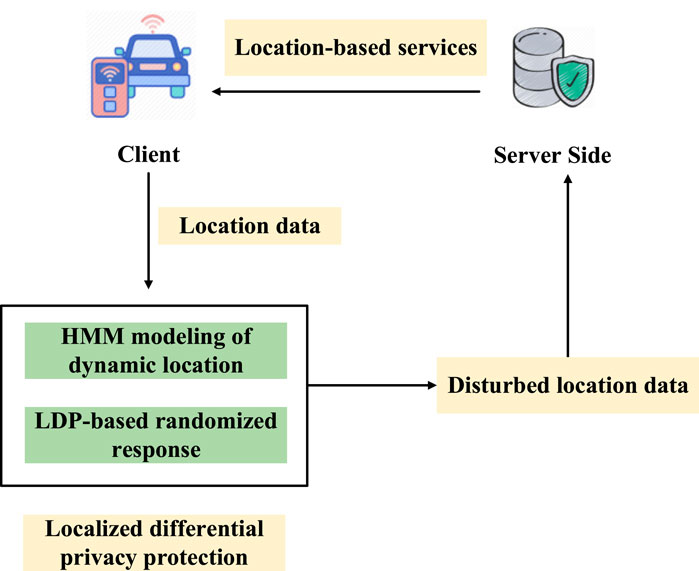 When a vehicle is in motion, spatial and temporal data need to be shared with the location-based application servers to maintain access to the services they provide. Users participating in tasks on the mobile crowdsourcing platform must also share location data to complete the collective intelligence-sensing tasks. In scenarios involving location information sharing, servers or service platforms maintain extensive records of users’ historical movement trajectories. Once an attacker obtains these records and analyzes the spatial and temporal correlation of the user’s mobile trajectory through modeling, it is possible to infer the user’s next mobile behavior, which may lead to the leakage of the user’s real location and related personal privacy. Therefore, the spatio-temporal correlation in the process of dynamic location change should be further considered when protecting vehicle location privacy. It is necessary not only to protect the real location information of the vehicle in real-time but also to ensure that the service provider can obtain aggregated analysis results with strong usability. Some of the existing dynamic location privacy protection methods have paid attention to the spatio-temporal correlation of vehicle location changes. However, there are still problems, such as high algorithmic complexity and poor usability of location data after privacy processing. To address the above problems, this study proposes a localized differential privacy location protection method based on the hidden Markov model (HMM). The main contributions of this paper are as follows.