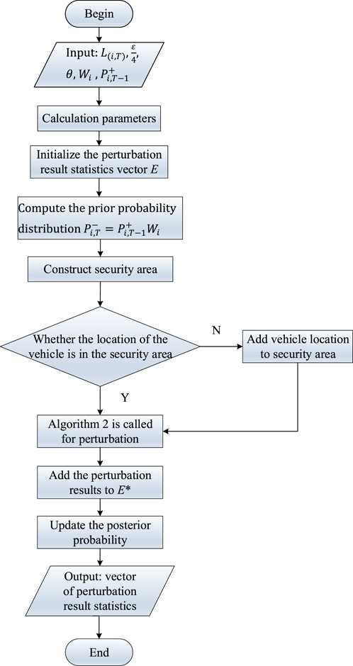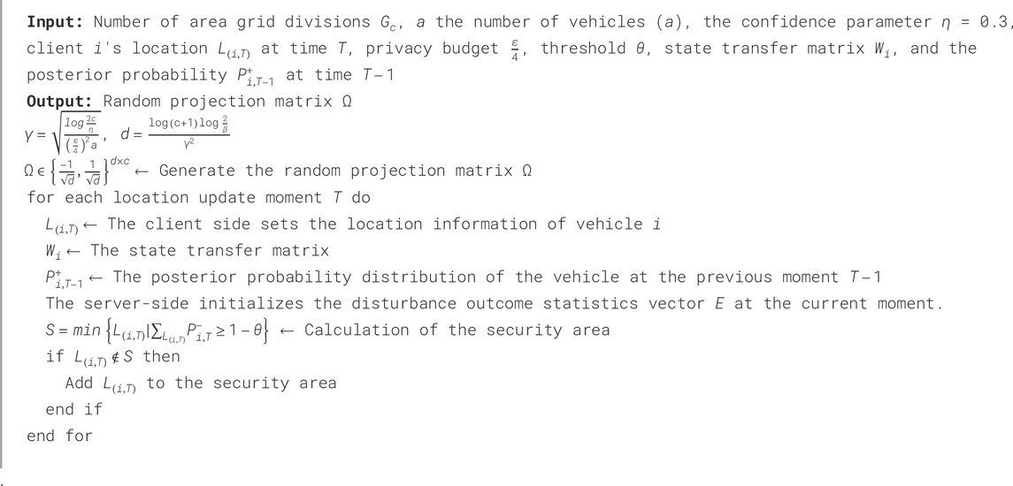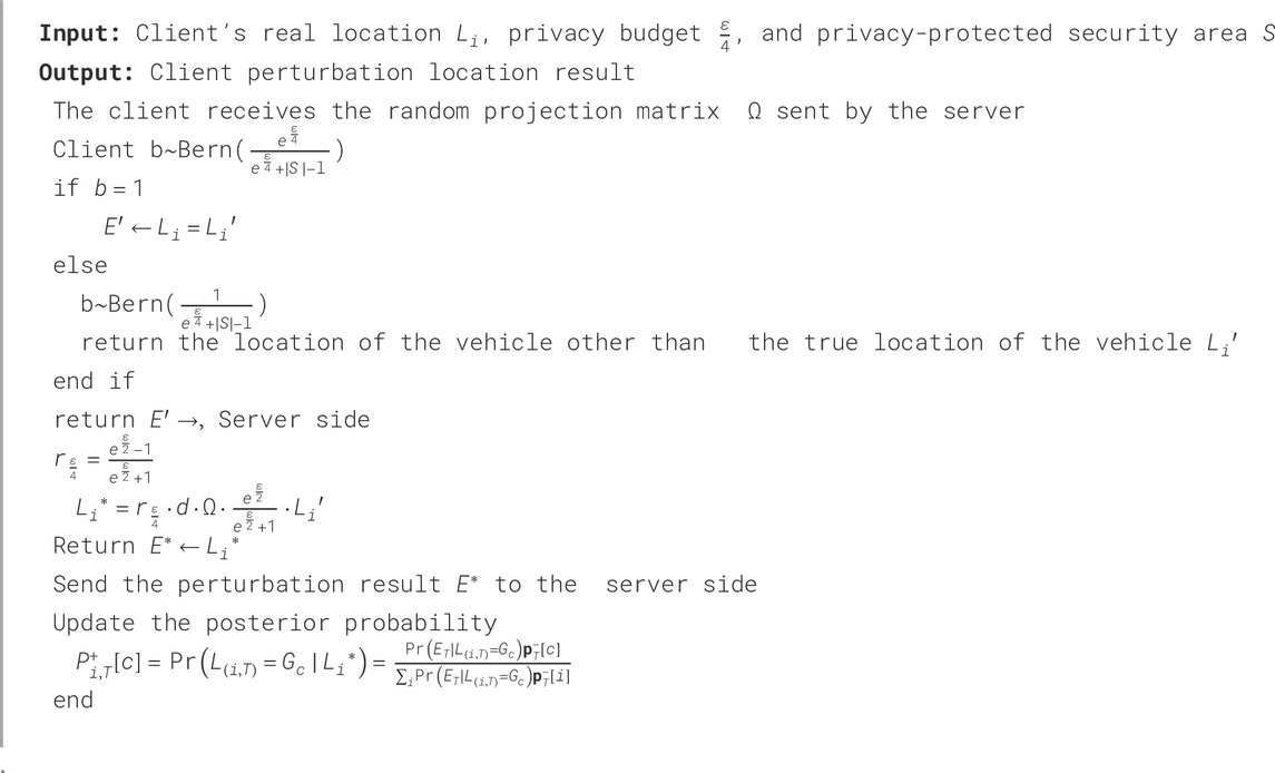 Algorithm 2 implements a localized differential privacy perturbation of the vehicle’s true position for each moment in time through the designed two random response processes. The client sends the perturbed location to the server side.