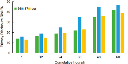 From the experimental results, it can be observed that the cumulative length of the client increases. On the whole, the privacy disclosure risk of the algorithm used in this paper is the smallest, which is approximately 24.22% on average. So, the probability of privacy disclosure of the algorithm used in this paper is the smallest, the privacy-protection strength is the largest, and the security is the highest. Through experimental comparison, it can be observed that when the cumulative length of the client is within 48 h, the privacy disclosure of this paper’s algorithm and that of the algorithm in [36] are similar. Therefore, the probability of privacy disclosure is similar for both methods, and both demonstrate strong privacy protection. However, after 48 h, because the algorithm in [36] ignores the processing of spatio-temporal correlation, as time progresses, the more background knowledge the attacker obtains, the greater the probability of privacy disclosure of the algorithm in [36]. The increase in the risk of disclosure is larger, and the privacy strength is weakened. For the algorithm in [37], the privacy protection effect is poorer because it ignores the consideration of the security area. Thus, as the cumulative length increases, the growth trend of privacy disclosure risk becomes more pronounced, with the maximum disclosure risk reaching 46.8%, indicating a significant increase in the likelihood of privacy leakage.