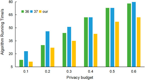 As observed from the experimental results in Figure 6, the running time of all three algorithms increases with an increase in the privacy budget. However, the overall running time of this paper’s algorithm is relatively shorter, with an average running time of approximately 39.17 s, which has a higher processing efficiency. The average running time of the algorithm in [36] is approximately 50 s, and the processing efficiency of the algorithm used in this paper is approximately 27.6% higher. The average running time of the algorithm in [37] is approximately 55.8 s, and the processing efficiency of the algorithm used in this paper is approximately 42.46%, so the processing efficiency of the method proposed in this paper is higher.