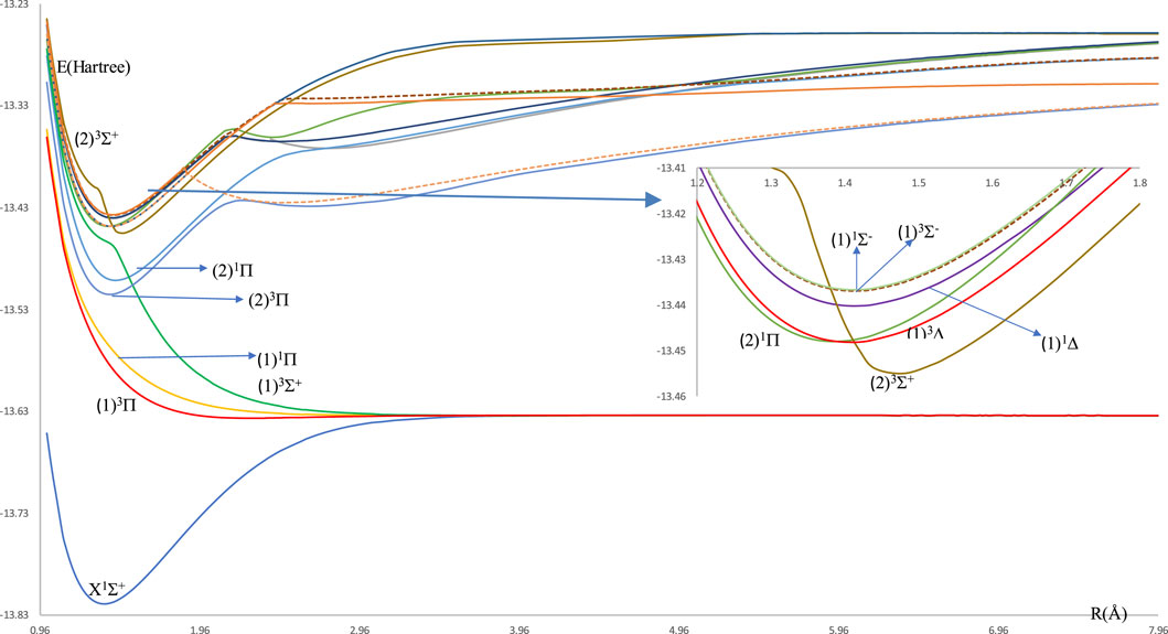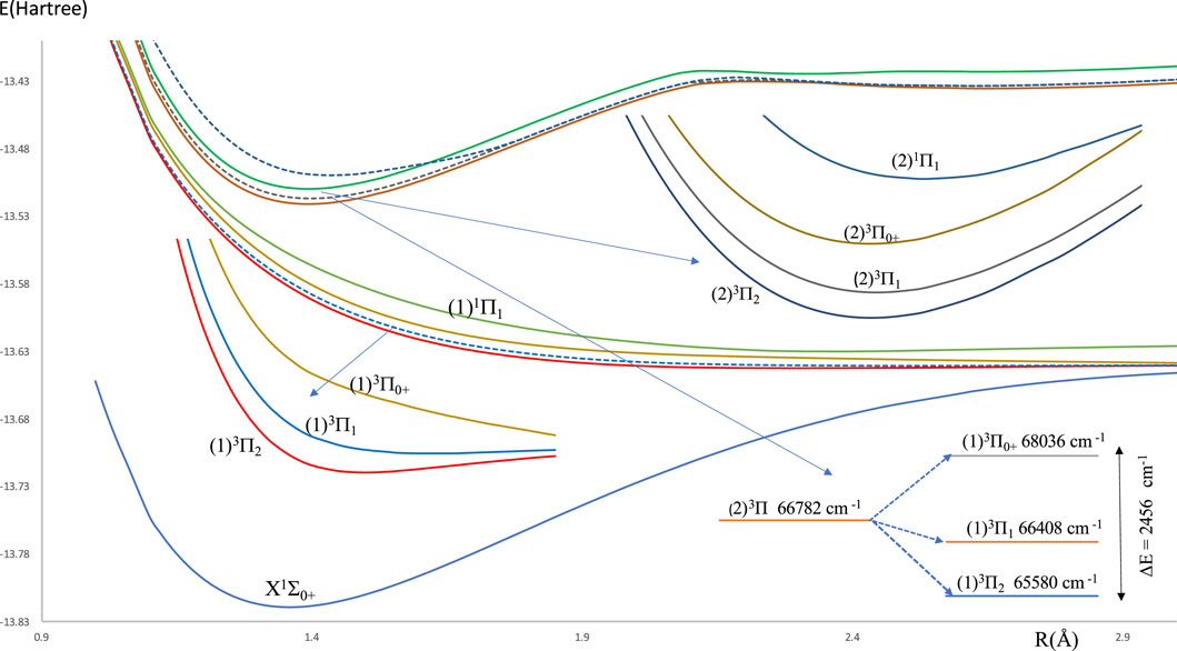 The investigated potential energy curves (PECs) for 14 singlet and triplet low-lying electronic states for the molecule HBr without the spin-orbit coupling effect are given in Figure 1. Most of these curves are bound and deep except the two electronic states (1)1Π and (1)3Σ+ are unbound, and the state (1)3Π is shallow. From these (PECs), we noticed the small difference between the internuclear distance ΔRe = 0.034 Å of the ground and (2)3Π states. This first step for the laser cooling of a molecule encouraged us to investigate the spin-orbit coupling of the low-lying electronic states of the considered molecule, where their potential energy curves are given in Figure 2. One can notice some unbound electronic states where the repulsive Coulomb forces overcome the attractive forces within the taken range of internuclear distance. These potential energy curves of all the investigated electronic states are plotted as a function of the internuclear distance R in the range of 0.96 Å to 7.96 Å. With the H atom at the origin, the investigated permanent dipole moment curves of the lowest electronic states with and without spin-orbit coupling of the molecule HBr are given in Supplementary Figure S1 in the Supplementary Material. In this Figure, some curves smoothly approach zero at large distances, where the molecule dissociates into neutral fragments. While other states as (2)3Π0, (2)3Π1, (2)3Π2, and (1)3Δ dissociated into ionic fragments in the negative region, and the state (2)1Σ+ dissociates in the positive region.