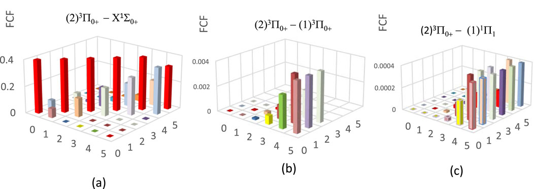 From the investigated values of the spectroscopic constants of Table 2, we noticed the small difference in the internuclear distance ΔRe = 0.035Å between the ground X1Σ0+ and the (2)3Π0+ states, which is the first step for the study of the suitability of a molecule for laser cooling. The main criterion for laser cooling this molecule with a closed-cycle loop is a diagonal Franck-Condon factor (FCF) without intervening states influencing the cycling between the two considered states. Between the two electronic states X1Σ0+ and the (2)3Π0+ states, one can notice the existence of the four intervening electronic states (1)3Π0+, (1)3Π1, (1)3Π2, and (1)1Π1. Two of these states, (1)3Π1 and (1)3Π2, are unbound, so it is impossible to give spontaneous emission life and FCFs of the transitions (2)3Π0+-(1)3Π1 and (2)3Π0+-(1)3Π2 [28]. While the two others are very shallow bound states. Figures 3b,c show the non-diagonality of the FCF of transitions (2)3Π0+ - (1)3Π0+, and (2)3Π0+ - (1)1Π1 among the vibrational levels v' = v = 0 (calculated by using the LEVEL 11 program [29]). For the vibrational levels v' = v = 0, the FCF of the transition (2)3Π0+ - X1Σ0+ is highly diagonal (Figure 3a), which is the first condition for a direct laser cooling of the molecule HBr. The second condition is the non-influence of the intermediate states (1)3Π0+ and (1)1Π1 on the cycling loop between X1Σ0+ and (2)3Π0+ states. This second condition is verified by the non-diagonality of the FCF of the two transitions (2)3Π0+ - (1)3Π0+, and (2)3Π0+ - (1)1Π1 given in Figures 3b,c. The third criterion for a successful laser cooling process which maximizes the cooling rate and produces a strong Doppler force for the electronic transition (2)3Π0+ - X1Σ0+ is a short radiative lifetime, which is given by τv′ = 1/ΣvAv′v, where the Einstein coefficient Av’v is formulated as in Equation 1 [30]