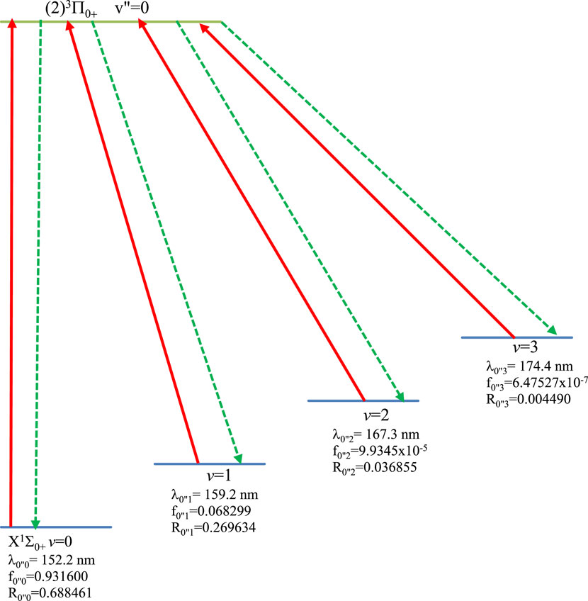 By using LEVEL 11 program [29], the energy difference between the two electronic states X1Σ0+ and (2)3Π0+ is ΔE and the computed value of the electronic transition dipole moment M(R) between these two states (in Debye) is plotted in Figure 4. Because of the non-influence of the intermediate states (1)3Π0+, (1)3Π1, (1)3Π2, and (1)1Π1 on the cycling loop of the transition (2)3Π0+ - X1Σ0+ the calculated values of the vibrational branching ratio for six vibrational levels of this transition (which is given by given by Rv″v =