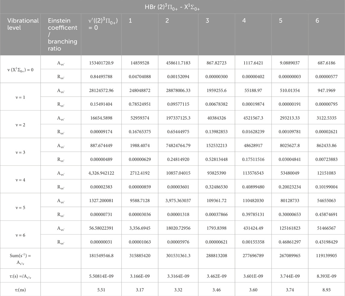 Table 3. The radiative lifetimes τ, and the Einstein coefficients and branching ratios of the vibrational transitions between the electronic states X1Σ0+ - (2)3Π0+ of the molecule HBr.