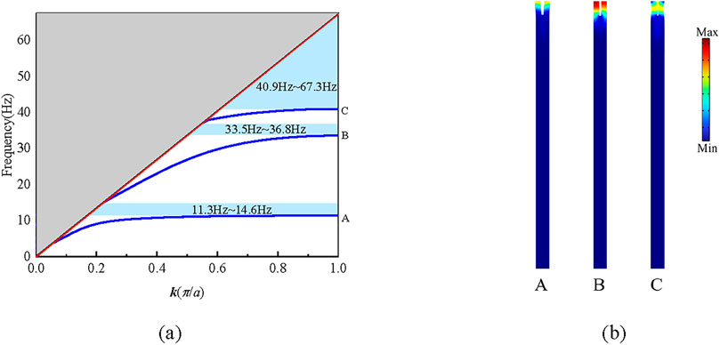 Figure 2a illustrates the dispersion curve of the periodic open trench-wave-impeding block combined vibration isolation barrier, with the normalized Bloch wave vector on the horizontal axis and the frequency on the vertical axis. Three bandgaps (blue shaded areas) clearly exist in the curves in the following ranges: first bandgap: 11.3 Hz–14.6 Hz, second bandgap: 33.5–36.8 Hz, and third bandgap: 40.9 Hz∼67.3 Hz. Since the frequency of the seismic wave is mainly located below 20 Hz, the ambient vibration Since the frequency of seismic wave is mainly located below 20 Hz, and the frequency of environmental vibration is around 30 Hz∼80 Hz, from the above bandgap analysis, it can be seen that the periodic air-gap-wave impeding block joint vibration isolation barrier covers the main bands of seismic wave and environmental vibration frequency respectively, and the superposition of the three bandgaps realizes a wide-frequency isolation from the low-frequency seismic wave to the high-frequency environmental vibration, which breaks through the band limitations of the traditional vibration isolation barriers. Figure 2b labels the vibration modes of three special points (A, B, C) on the dispersion curve, which reveal the formation mechanisms of different bandgaps. For the point A mode the displacement amplitude in the characteristic air-gap region is the largest, and the wave impeding block has almost no deformation. The low-frequency band gap is dominated by the local resonance effect. The trench acts as a “soft” unit and forms a mass-spring system with the surrounding foundation, which resonates at a specific frequency. For point B, the displacement at the junction of the wave impeding block and the trench fluctuates violently, forming a standing wave mode. For point C, the air-gap exhibits high-frequency bending vibration with a complex displacement distribution in the air-gap region. The high-frequency bandgap is formed by impedance mismatch and mode coupling, and the high stiffness of the wave impeding block and the flexibility of the foundation form a strong impedance contrast, reflecting high-frequency waves. Meanwhile, the geometric scattering of the air gap further dissipates the energy. By analyzing the vibration modes and bandgap mechanisms at points A, B, and C, the multiscale modulation capability of the periodic open trench-wave impeding block joint barrier is revealed: the low-frequency relies on the local resonance, and the medium- and high-frequency relies on the impedance mismatch and Bragg scattering. The synergistic effect of the three bandgaps realizes the full-frequency coverage from seismic waves to environmental vibrations, providing an efficient broadband vibration damping solution for complex underground projects.