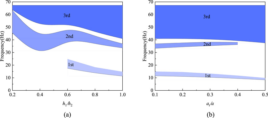 Figure 3 shows that the bandgap range of the combined periodic open trench wave impeding block vibration isolation barrier is significantly affected by the geometrical parameters. The ratio of the depth of the open trench to the depth of the wave impeding block(h1/h2) significantly affects the low-frequency bandgap by regulating the balance between local resonance and Bragg scattering. From Figure 3a, it can be seen that the first bandgap starts to appear when h1/h2 increases from 0.2 to 0.6, and the increase in the depth of the open trench reduces the overall stiffness of the single cell, which shifts the local resonance frequency to lower frequencies and significantly increases the bandgap width. From Figure 3b, it can be seen that the open trench width ratio (at/a), on the other hand, controls the Bragg scattering efficiency of the mid- and high-frequency bandgap, and when the ratio at/a increases from 0.1 to 0.4, the second-order bandgap disappears, and the first-order bandgap and the third-order bandgap show a decreasing trend. When the period constant a is fixed, its value directly determines the critical wavelength of Bragg scattering, thus locking the center frequency range of the bandgap, while the adjustment of the null channel width at (i.e., the variation of the null channel width ratio at/a) enhances the phase-cancelling interference efficiency by expanding the range of the scattering interface, but if at/a is too large, the open trench occupies the main volume of the single cell will weaken the mass inertia effect of the wave impeding block, leading to the narrowing of the low-frequency bandgap width.