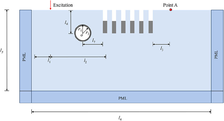 In order to verify the accuracy of the dispersion relationship and the vibration isolation performance of the periodic combined vibration isolation barrier, and considering the scattering effect of the existing tunnel on the vibration wave, a two-dimensional finite element model is established as shown in Figure 5, and six rows of barriers are set up. A vertical harmonic load with an amplitude of 1000 N is applied to the input end on the left side of the model, and the output end point A is set on the right side of the model to detect the surface displacement amplitude. A PML matching layer is added to the boundary around the model to prevent the reflection of the vibration wave from the boundary. The specific dimensions of the model are as follows: l1 = 5 m, l2 = 20 m, l3 = 3 m, l4 = 4 m, l5 = 15 m, l6 = 8, l7 = 10 m, r1 = 3 m, r2 = 2.7 m. In order to evaluate the vibration isolation performance of the periodic wave barrier considering tunnel scattering, the transmission attenuation (TA) coefficient (Equation 6) defined by Gao et al. [26] is used to measure the vibration isolation effect of the periodic combined vibration isolation barrier: