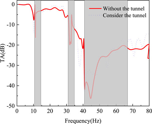 Figure 6 verifies the correctness of the 3.2-section dispersion curve by the transmission attenuation coefficient, and reveals the enhancement mechanism of the tunnel on the vibration isolation performance. Without considering the influence of the tunnel, the TA curve is consistent with the predicted band gap range of the dispersion curve. The peak attenuation value in the low frequency band is 16 dB, and the peak attenuation in the middle and high frequency band can reach 45 dB, which corresponds to the band gap generated by local resonance and Bragg scattering, respectively. The accuracy of the theoretical model is verified. When considering the influence of the tunnel, the band gap range predicted by the dispersion curve is roughly consistent. As the frequency increases, it can be seen that in the low frequency band, the transmission curve considering the existence of the tunnel is roughly the same as that without considering the existence of the tunnel, and there is a significant difference in the middle and high frequency bands. In the middle frequency range of f = 36 Hz ∼ 40 Hz, the transmission curve considering the influence of the tunnel has a significant attenuation. Compared with the peak attenuation difference of the transmission curve without considering the influence of the tunnel, the difference can reach 46%. This is because the buried depth of the tunnel is shallow, and the wave field in the intermediate frequency band is just equal to the buried depth of the tunnel. Most of the elastic waves are reflected by the tunnel and scattered into the interior of the foundation, which results in the difference of vibration isolation effect before and after considering the influence of the tunnel. When the vibration frequency increases to a higher range, it can also be seen from the figure that in the high frequency band, the transmission curves in the two cases are roughly the same. This is because the wavelength of the high frequency band is small, and only a part of the elastic wave will be reflected and scattered by the tunnel.