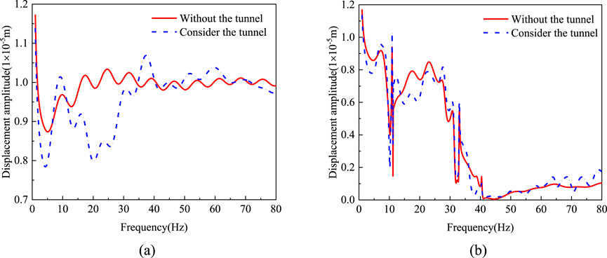 In order to further analyze the causes of the difference in vibration isolation effect caused by the existence of the tunnel, Figure 7 shows the variation curve of the vertical displacement of the ground surface with and without the vibration isolation barrier with frequency. From Figure 7a, it can be seen that when there is no barrier, the vertical displacement of the surface in the tunnel is obviously different in the range of 15 Hz–40 Hz. When the frequency increases to the high frequency band, the difference of surface displacement in the two cases decreases. It can be seen from Figure 7b that the vertical displacement of the ground surface has obvious attenuation in some local frequency bands after the vibration isolation barrier is set, which corresponds to the band gap range of the periodic vibration isolation barrier. In addition, Figure 7b also shows the joint action mechanism of the tunnel and the periodic vibration isolation barrier, that is, after considering the existence of the tunnel, the elastic wave reflected by the periodic vibration isolation barrier in the band gap range will be affected by the tunnel, and the secondary reflection and scattering will occur, which will cause significant differences in the vibration isolation effect.
