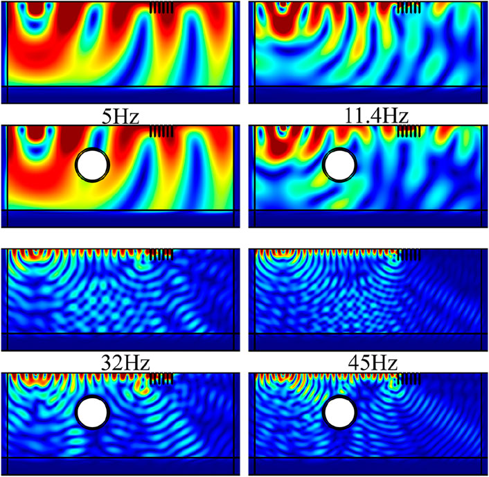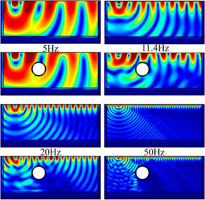 In order to demonstrate the above mentioned mechanism of joint action of tunnel and periodic vibration isolation barrier on elastic waves, the foundation displacement clouds at different frequencies before and after considering the effect of tunnel without barrier and after setting up the barrier are given in Figures 8, 9, respectively. The comparison between Figure 8 (without barrier) and Figure 9 (with barrier) reveals the mechanism of joint vibration isolation by tunnel and periodic barrier at different frequencies. Low frequency band (5 Hz): without barrier, the tunnel has limited reflection efficiency for long wavelength seismic waves and the low frequency vibration at 5 Hz is not within the band gap, the corresponding displacement maps with or without tunnel are roughly the same. When the frequency is increased to 11.4 Hz, the tunnel reflects the elastic wave without barrier as can be seen from Figure 8, and the local displacement of the surface becomes larger. When the barrier is set up, part of the surface wave energy is localized and another part is reflected by the barrier to the interior of the foundation, while part of the elastic wave is reflected by the tunnel. When the frequency is increased to 20 Hz and 32 Hz, the bypassing of the 20 Hz wave by the tunnel without barrier leads to the concentration of lateral displacement. After the barrier is set up, the barrier scatters through Bragg, and the tunnel reflected wave and the barrier scattered wave form a phase cancellation interference, which significantly optimizes the isolation efficiency of the main frequency of rail traffic vibration. When the frequency is increased to 45 Hz and 50 Hz, without the barrier, the tunnel has a weak effect on the short wavelengths generated at 50 Hz, and the displacement distribution is similar to that of the free field. After setting up the barrier, the barrier suppresses the 45 Hz displacement by high-frequency Bragg scattering, and the displacement in the region behind the barrier is affected due to the standing wave modes of the tunnel-barrier gap, resulting in oscillatory variations of the transmission curves in Figure 6 under the consideration of the tunnel effect.