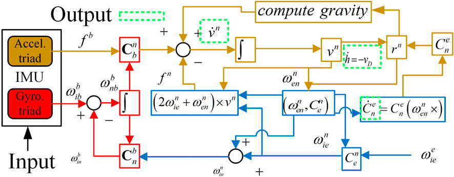 The quaternion form is utilized to update the position, as shown in Equation 5, for the horizontal position (latitude and longitude) to prevent numerical integration errors. The height can be updated independently using Equation 6.
