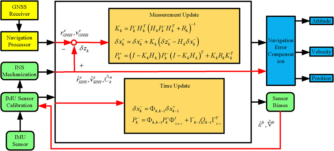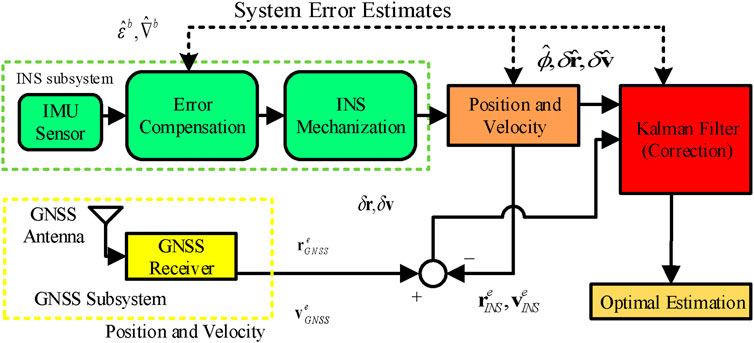 The solution of standard KF (i.e., optimal estimates of navigation errors and inertial sensor biases) is obtained by solving this least-square problem. However, it is important to note that this solution is highly sensitive to model errors. Therefore, in the LC GNSS/INS system, a standard KF is utilized, as illustrated in Figure 4.