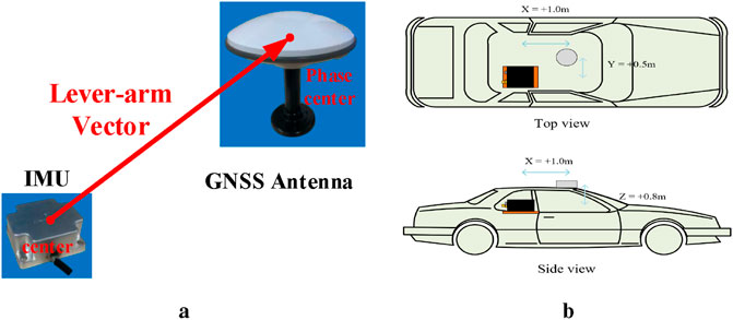 As shown in Figure 3, GNSS antenna and IMU are fixed at different positions, forming the lever-arm vector
