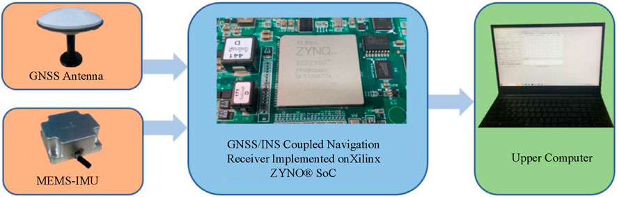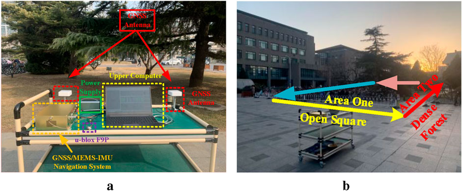The pre-experiment was carried out on the campus of Peking University (PKU) in Beijing, China. As shown in Figure 6, the Programmable Logic (PL) of ZynqⓇ SoC is used for GNSS baseband signal processing and MEMS-IMU data collection. While GNSS positioning algorithm, INS mechanization and ESKF are implemented with Processing System (PS) of the chip. Table 2 gives the observation rate of GNSS receiver and MEMS-IMU. In Figure 7a, we designed and assembled a dedicated experimental system. The GNSS/MEMS-IMU navigation unit (blue component) executes both LC and TC algorithms independently under identical environmental conditions to derive their respective position outputs. Since the performance of the IMU plays a crucial role in the positioning accuracy of GNSS/INS integration, we include detailed specifications of the MEMS-IMU employed in the test. These specifications are summarized in Table 3. Additionally, a u-blox F9P receiver was utilized to capture high-precision position data, serving as the ground truth reference.