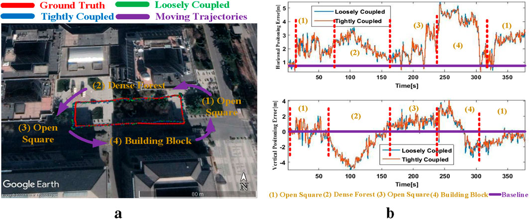 As illustrated in Figure 7b, the receiver travels from Area One to Area Two, corresponding to an open square and dense forest. This route allows for the assessment of positioning performance under varying GNSS signal conditions. The resulting trajectories are visualized using Google Earth. Figure 8a presents the movement paths derived from the receiver shown in Figure 7a. Figure 8b depicts the horizontal and vertical position errors, clearly indicating that dense vegetation and surrounding buildings negatively affect positioning accuracy. The trajectory in Figure 8a reveals that the receiver traverses four distinct environments, eventually forming a closed-loop path. These four regions and their corresponding baselines are approximately marked in Figure 8b. It is evident that both LC and TC achieve lower positioning errors in the open square (1) and open square (3), confirming that the quality of GNSS signals has a direct influence on accuracy. This further highlights that LC performs more reliably when signal conditions are favorable.