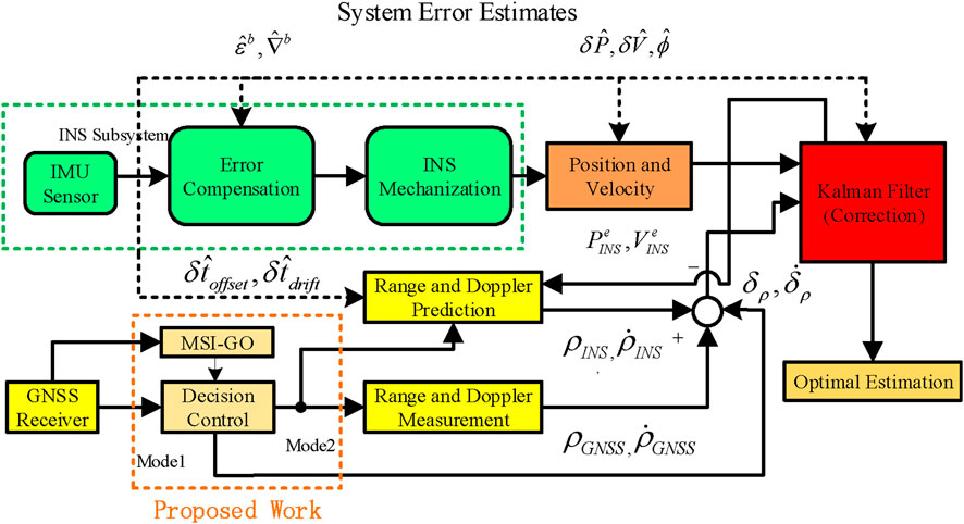 The HI GNSS/INS system leverages the strengths of both LC and TC approaches. By dynamically switching between positioning modes under the management of the MSI-GO, HI GNSS/INS achieves a balance between positioning accuracy and computational efficiency. As illustrated in Figure 9, the system architecture integrates both LC and TC modes. The components proposed in this study are highlighted within the brown dashed box in Figure 9.