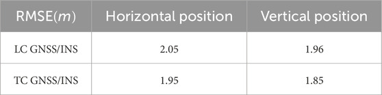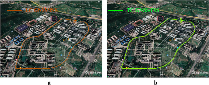 The results of this pre-experiment demonstrate that both LC and TC methods exhibit a significant improvement in positioning accuracy when operating in environments with strong GNSS signals, such as open squares. Under practical conditions, the positioning error of TC GNSS/INS in these areas is observed to be smaller than that of LC GNSS/INS. This finding indicates that LC is capable of delivering high-precision positioning when GNSS signal conditions are favorable. Moreover, the comparative analysis between LC and TC suggests that LC remains a dependable solution for real-world navigation tasks in scenarios where signal quality is sufficient. Hence, it can be concluded that the quality of GNSS signals is a decisive factor in achieving reliable and accurate navigation.