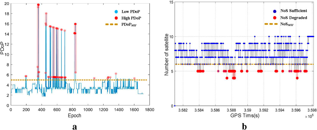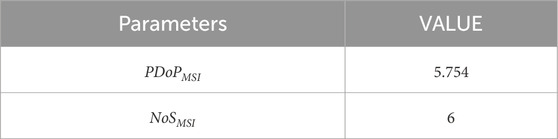 Figure 12 illustrates the PDoP and NoS values for LC and TC within the HI GNSS/INS framework. These datasets correspond to the parameters defined in Equation 31 and are utilized in the calculation of the