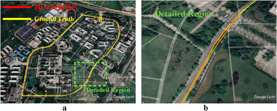 Figure 14. Trajectories of HI GNSS/INS. (a) Trajectories shown on Google Earth. (b) Trajectories in detailed region.