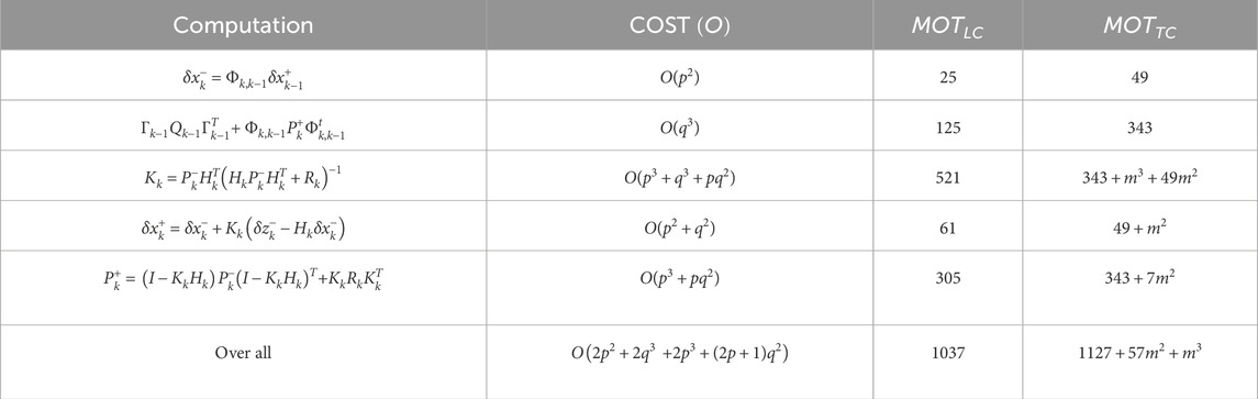 The results of the pre-experiment reveal that GNSS signal quality plays a pivotal role in the performance of both LC and TC systems in real-world scenarios. TC exhibits greater robustness under varying signal conditions, while LC is capable of achieving acceptable positioning accuracy when GNSS signals remain strong and stable. Notably, TC leverages Kalman filtering for more sophisticated GNSS data processing, which enhances accuracy but also introduces higher computational costs. In contrast, LC features a straightforward structure and ease of implementation, making it highly practical for resource-constrained applications. Against this backdrop, this study aims to investigate the potential advantages of combining the complementary features of LC and TC. Before delving into the integration strategy, it is essential to first analyze and compare the computational complexity of the LC and TC frameworks, as presented in the following part.